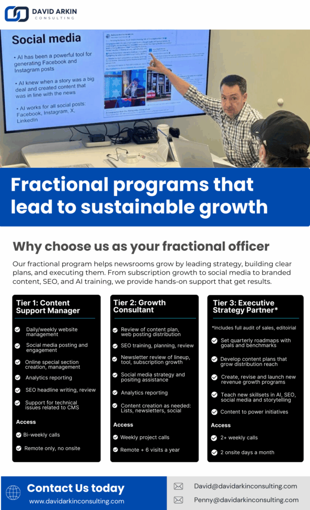 Tier 3: Executive Strategy Partner: We act as an extension of your leadership team, starting with a full audit of editorial, sales and design. From there, we set quarterly roadmaps, develop new revenue programs, and teach the latest skills in AI, SEO and storytelling.